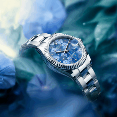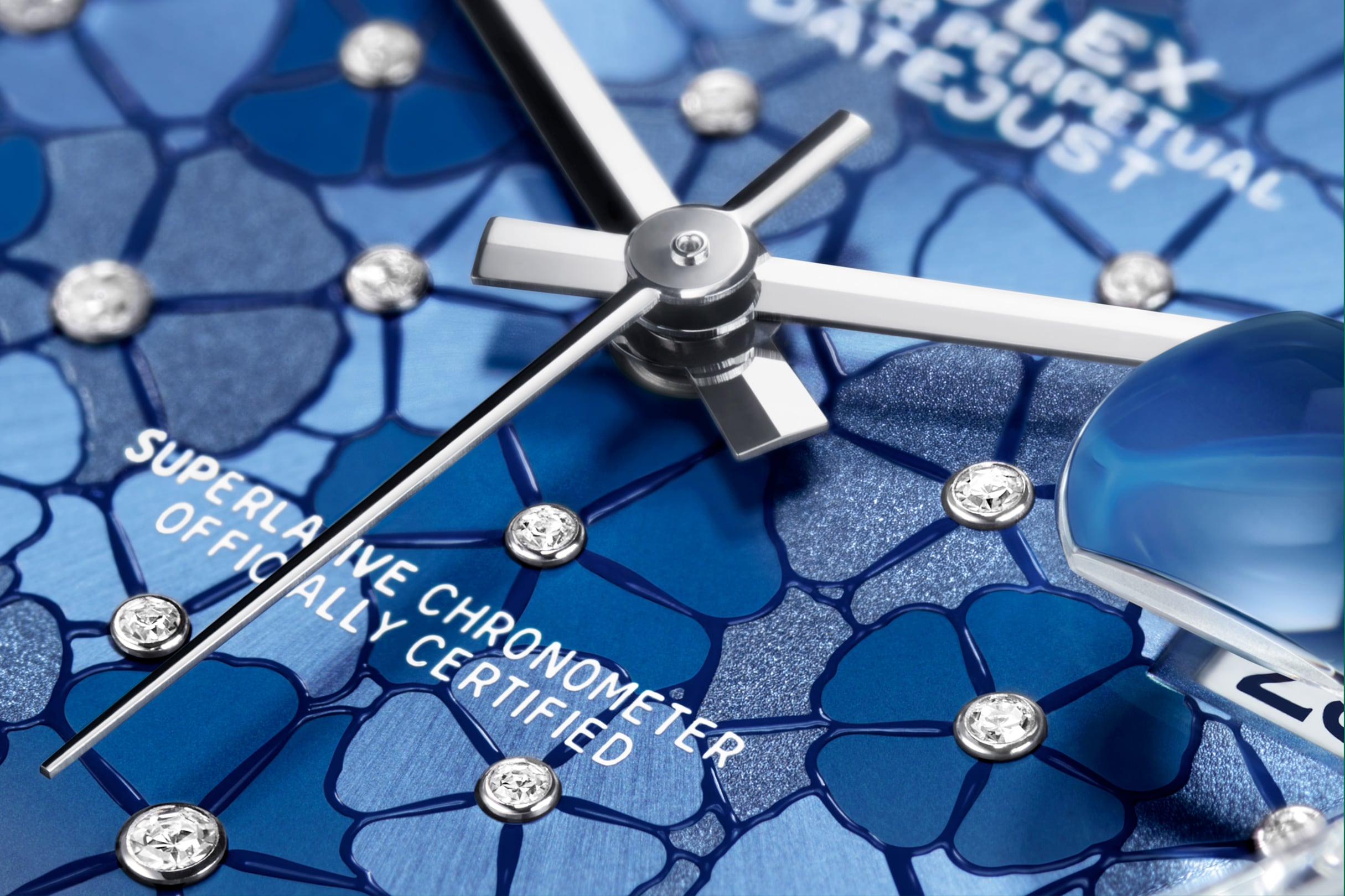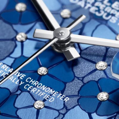 - Dial color: Azzurro blue dial with floral motif and 24 diamonds framed in 18k White Gold