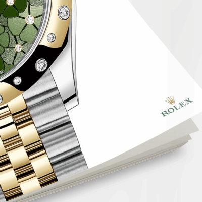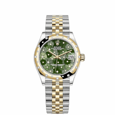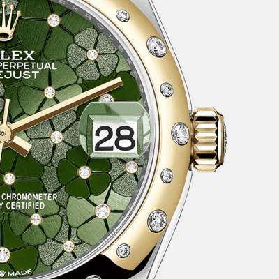 - Dial color: Olive green dial with floral motif and 24 Diamonds in 18k Yellow Gold settings