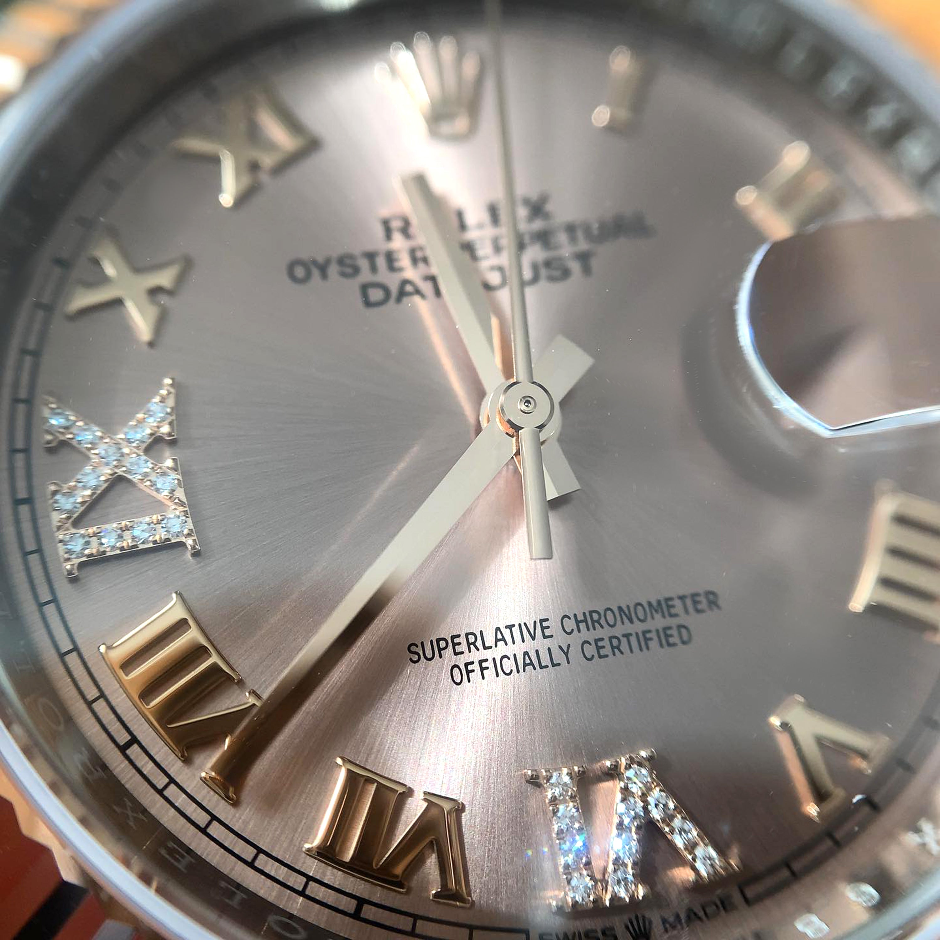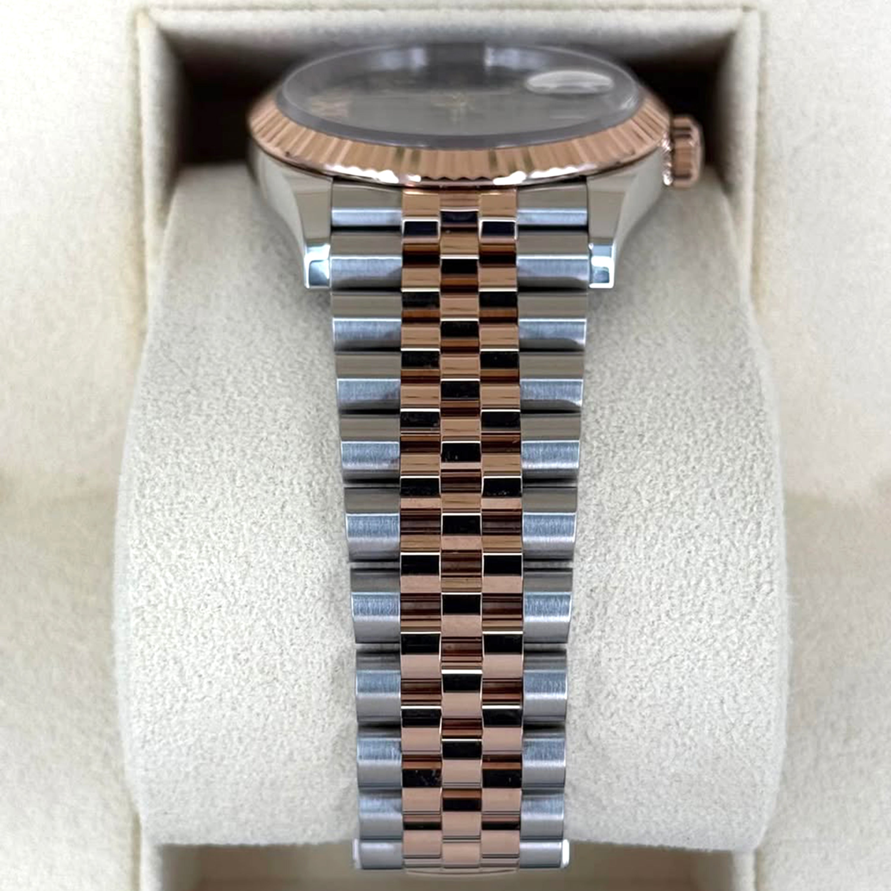 Rolex Datejust 36 watch with polished 18k Everose Gold and Stainless Steel case, Reference 126231-0023. This model has Grey ‘Dark Rhodium’ dial with a fine sunray finish. The dial is adorned applied polished 18k Everose Gold Roman numeral hour markers also VI and IX in 18k Everose gold, set with 24 diamonds and polished 18k Everose Gold hands. Fine printed minute track on teh dial perimeter. Date window with a “Cyclops” magnifying lens displayed at the 3 o’clock position. Polished 18k Everose Gold “Twinlock” crown, featuring two sealed zones when the crown is screwed down: the first inside the tube of the crown, the second inside the winding crown itself. The dial closed by a Scratch-resistant Sapphire Crystal and solid case back made. The watch is equipped fluted fixed polished 18k Everose Gold bezel. The watch is mechanical self-winding Manufacture Rolex 3235 contains 31 Jewels and has an approximate power reserve of 70 hours of power reserve. This model presented on Jubilee bracelet of brushed Stainless Steel outer links and polished 18k Everose Gold center links with a Folding Oysterlock safety clasp with Easylink 5 mm comfort extension link. The water resistance is up to 100m/330ft (10 ATM). The watch is Superlative Chronometer certified: the movement is COSC certified prior to casing, then it is tested a second time by Rolex after being cased to ensure accuracy.