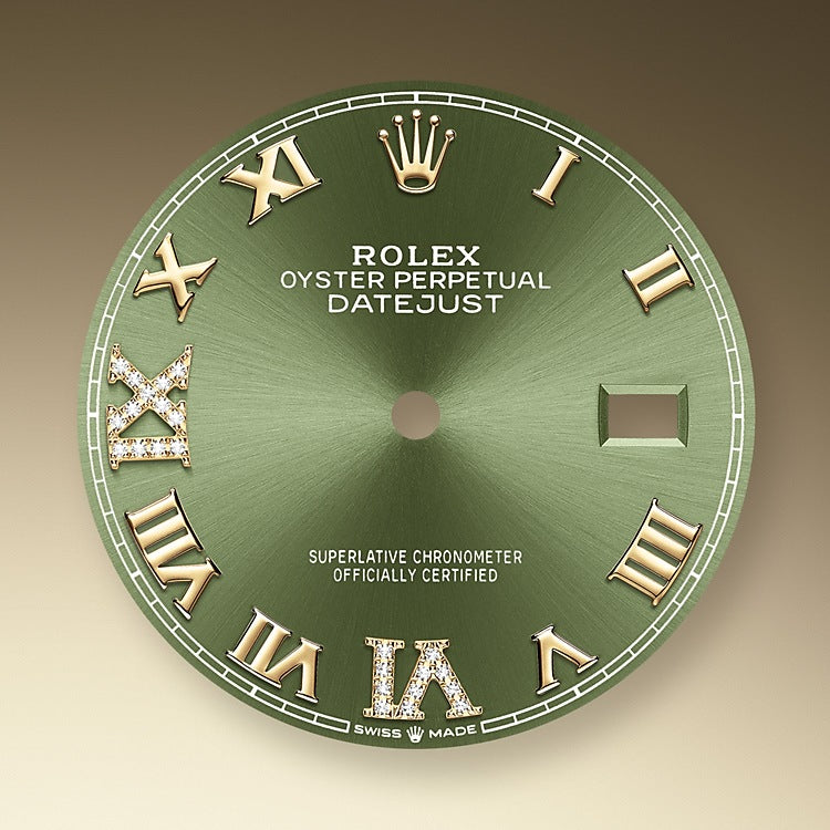Rolex Datejust 36 watch with polished 18k Yellow Gold and Stainless Steel case, Reference 126203-0026. This model has Olive green dial with polished 18k Yellow Gold hands. The dial is adorned applied polished 18k Yellow Gold Roman numeral hour markers also VI and IX in 18k Yellow gold, set with 24 diamonds. Fine printed minute /seconds track on teh dial perimeter. Date window with a “Cyclops” magnifying lens displayed at the 3 o’clock position. Polished 18k Yellow Gold “Twinlock” crown, featuring two sealed zones when the crown is screwed down: the first inside the tube of the crown, the second inside the winding crown itself. The dial closed by a Scratch-resistant Sapphire Crystal and solid case back made. The watch is equipped domed fixed polished 18k Yellow Gold bezel. The watch is mechanical self-winding Manufacture Rolex 3235 contains 31 Jewels and has an approximate power reserve of 70 hours of power reserve. This model presented on Oyster bracelet of brushed Stainless Steel outer links and polished 18k Yellow Gold center links with a Folding Oysterlock safety clasp with Easylink 5 mm comfort extension link. The water resistance is up to 100m/330ft (10 ATM). The watch is Superlative Chronometer certified: the movement is COSC certified prior to casing, then it is tested a second time by Rolex after being cased to ensure accuracy.