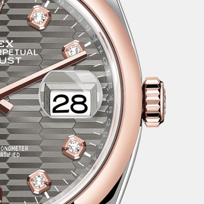 - Dial color: Slate dial with fluted motif and 10 Diamonds as hour markers framed in 18k Everose Gold