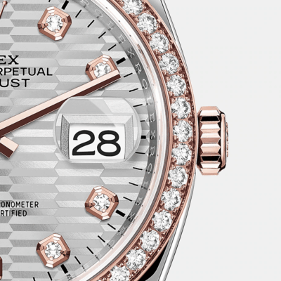 - Dial color: Silver dial with fluted motif and 10 Diamonds as hour markers framed in 18k Everose Gold