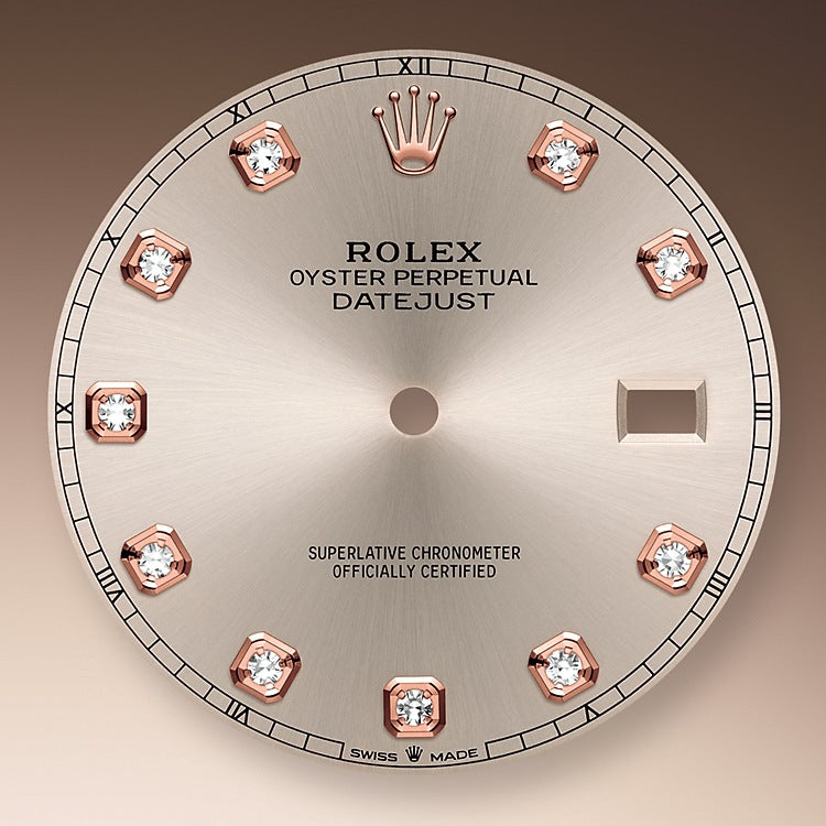 Rolex Datejust 41 watch with polished 18k Everose Gold and Stainless Steel case, Reference 126331-0007. This model has Sundust dial with a fine sunray. The dial is adorned with polished 18k Everose Gold hands and Hour markers are 10 Diamonds in 18k Everose Gold settings. Fine printed minute track on teh dial perimeter. Moreover, every five minutes are marked with Roman numerals. Date window with a “Cyclops” magnifying lens displayed at the 3 o’clock position. Polished 18k Everose Gold “Twinlock” crown, featuring two sealed zones when the crown is screwed down: the first inside the tube of the crown, the second inside the winding crown itself. The dial closed by a Scratch-resistant Sapphire Crystal and solid case back made. The watch is equipped Fluted fixed polished 18k Everose Gold bezel. The watch is mechanical self-winding Manufacture Rolex 3235 contains 31 Jewels and has an approximate power reserve of 70 hours of power reserve. This model presented on Oyster bracelet of brushed Stainless Steel outer links and polished 18k Everose Gold center links with a Folding Oysterlock safety clasp with Easylink 5 mm comfort extension link. The water resistance is up to 100m/330ft (10 ATM).