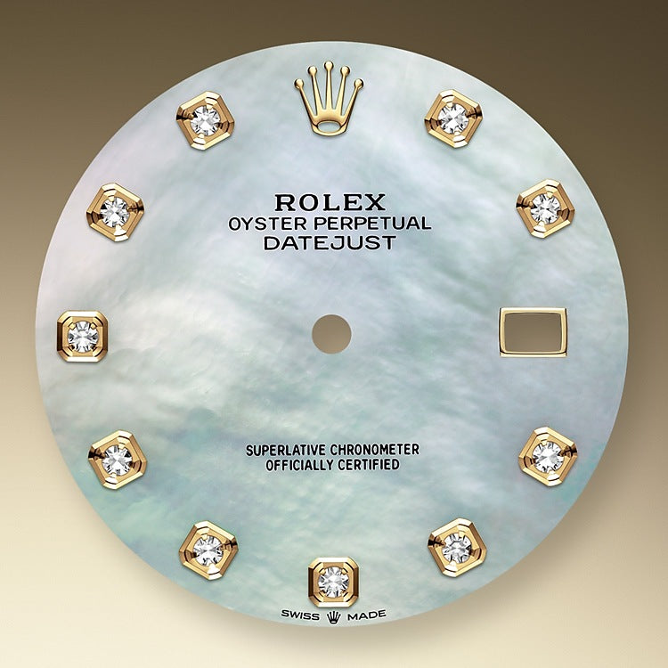 Rolex Datejust 41 watch with polished 18k Yellow Gold and Stainless Steel case, Reference 126333-0017. This model has White mother-of-pearl dial with polished 18k Yellow Gold hands and Hour markers are 10 Diamonds in 18k Yellow Gold settings. Date window with a “Cyclops” magnifying lens displayed at the 3 o’clock position. Polished 18k Yellow Gold “Twinlock” crown, featuring two sealed zones when the crown is screwed down: the first inside the tube of the crown, the second inside the winding crown itself. The dial closed by a Scratch-resistant Sapphire Crystal and solid case back made. The watch is equipped Fluted fixed polished 18k Yellow Gold bezel. The watch is mechanical self-winding Manufacture Rolex 3235 contains 31 Jewels and has an approximate power reserve of 70 hours of power reserve. This model presented on Oyster bracelet of brushed Stainless Steel outer links and polished 18k Yellow Gold center links with a Folding Oysterlock safety clasp with Easylink 5 mm comfort extension link. The water resistance is up to 100m/330ft (10 ATM).