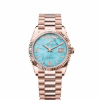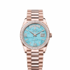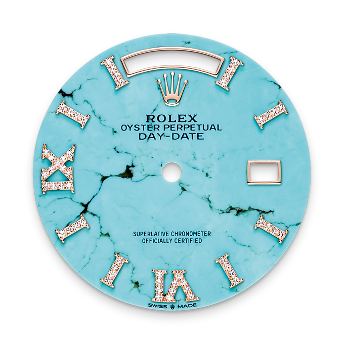 Unworn watch Rolex Day-Date 36, 18k Everose Gold, 36mm, Ref# 128345rbr-0065. New for 2023 in the Oyster Perpetual Day-Date 36, series are watches with dials made of decorative stones. Thanks to the unique crystallized effects, matrices and veins of aventurine, carnelian and turquoise, and their skillful processing, each dial turns into a unique work of art, being a worthy addition to the rest of the flawless Day-Date details. As always elegant and luxurious Day-Date 36 – is an excellent choice for people who appreciate unique beauty, high style and absolute comfort. The turquoise dial will not leave indifferent any connoisseur of beauty and sophistication. Its index hour markers and Roman numerals VI and IX in 18k Everose Gold are respectively set with 32 and 24 diamonds, using a flawless setting and leveling technique that highlights the stones’ subtle brilliance. The classic polished hands made of 18k Everose Gold look amazing on such a dial, emphasizing the sophistication of the model. The date indicator is traditionally placed at the 3 o’clock position. At the 12 o’clock, position is a semi-circular window showing the day of the week in full, providing an instantly recognizable, unique design of Day-Date. The ribbed screw-down crown in 18k Everose Gold Triplock with double watertight system, adorned with the Rolex logo, is a traditionally recognizable part of Rolex watches. The dial is covered with a scratch-resistant anti-reflective sapphire crystal and a Cyclops lens above the date with double anti-reflective coating. A solid 18k Everose Gold screw-down case back with fine fluted edges, closes the movement. Fixed 18k Everose Gold bezel set with 52 brilliant-cut diamonds – sparkling a symphony that will adorn the watch and enchant its owner. The in-house Rolex mechanical movement, caliber 3255, contains 31 jewels and has an approximate power reserve of approximately 70 hours powers. This delightful timepiece is presented on an 18k Everose Gold Diamond-set President bracelet with semi-circular 3-piece links for flawless beauty. It features Rolex’s original concealed folding Crownclasp to secure the watch on your wrist. Water resistant up to 100m/330ft (10 ATM).