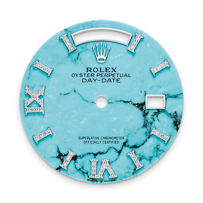 Unworn watch Rolex Day-Date 36, 18k White Gold, 36mm, Ref# 128239-0044. New for 2023 in the Oyster Perpetual Day-Date 36, series are watches with dials made of decorative stones. Thanks to the unique crystallized effects, matrices and veins of aventurine, carnelian and turquoise, and their skillful processing, each dial turns into a unique work of art, being a worthy addition to the rest of the flawless Day-Date details. As always elegant and luxurious Day-Date 36 – is an excellent choice for people who appreciate unique beauty, high style and absolute comfort. The turquoise dial will not leave indifferent any connoisseur of beauty and sophistication. Its index hour markers and Roman numerals VI and IX in 18k White Gold are respectively set with 32 and 24 diamonds, , using a flawless setting and leveling technique that highlights the stones’ subtle brilliance. The classic polished hands made of 18k White Gold look amazing on such a dial, emphasizing the sophistication of the model. The date indicator is traditionally placed at the 3 o’clock position. At the 12 o’clock, position is a semi-circular window showing the day of the week in full, providing an instantly recognizable, unique design of Day-Date. The ribbed screw-down crown in 18k White Gold Triplock with double watertight system, adorned with the Rolex logo, is a traditionally recognizable part of Rolex watches. The dial is covered with a scratch-resistant anti-reflective sapphire crystal and a Cyclops lens above the date with double anti-reflective coating. A solid 18k White Gold screw-down case back with fine fluted edges, closes the movement. The fluted fixed 18k White Gold bezel is not only an aesthetic element of this watch, but also a true hallmark of Rolex. The in-house Rolex mechanical movement, caliber 3255, contains 31 jewels and has an approximate power reserve of approximately 70 hours powers. This delightful timepiece is presented on a 18k White Gold President bracelet with semi-circular 3-piece links for flawless beauty. It features Rolex’s original concealed folding Crownclasp to secure the watch on your wrist. Water resistant up to 100m/330ft (10 ATM).