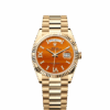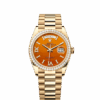 Unworn watch Rolex Day-Date 36, 18k Yellow Gold with Diamond-set, 36mm, Ref# 128238-0089. New for 2023 in the Oyster Perpetual Day-Date 36, series are watches with dials made of decorative stones. Thanks to the unique crystallized effects, matrices and veins of aventurine, carnelian and turquoise, and their skillful processing, each dial turns into a unique work of art, being a worthy addition to the rest of the flawless Day-Date details. As always elegant and luxurious Day-Date 36 – is an excellent choice for people who appreciate unique beauty, high style and absolute comfort. The dial is carved from Carnelian, an orange-colored stone characterized by lines of various shapes and sizes, forming an intricate cameo of patterns. Its index hour markers and Roman numerals VI and IX in 18k Yellow Gold are respectively set with 32 and 24 diamonds, using a flawless setting and leveling technique that highlights the stones’ subtle brilliance. The classic polished hands made of 18k Yellow Gold look amazing on such a dial, emphasizing the sophistication of the model. The date indicator is traditionally placed at the 3 o’clock position. At the 12 o’clock, position is a semi-circular window showing the day of the week in full, providing an instantly recognizable, unique design of Day-Date. The ribbed screw-down crown in 18k Yellow Gold Triplock with double watertight system, adorned with the Rolex logo, is a traditionally recognizable part of Rolex watches. The dial is covered with a scratch-resistant anti-reflective sapphire crystal and a Cyclops lens above the date with double anti-reflective coating. A solid 18k Yellow Gold screw-down case back with fine fluted edges, closes the movement. The fluted fixed 18k Yellow Gold bezel is not only an aesthetic element of this watch, but also a true hallmark of Rolex. The in-house Rolex mechanical movement, caliber 3255, contains 31 jewels and has an approximate power reserve of approximately 70 hours powers. This delightful timepiece is presented on an 18k Yellow Gold with Diamond-set President bracelet with semi-circular 3-piece links for flawless beauty. It features Rolex’s original concealed folding Crownclasp to secure the watch on your wrist. Water resistant up to 100m/330ft (10 ATM).
