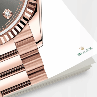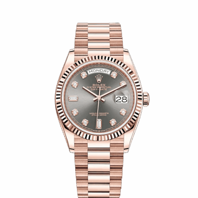 - Dial color: Slate dial with a fine sunrays and 10 Diamonds as hour markers framed in 18k Everose Gold, 2 of which are baguette-cut at 6 and 9 o’clock