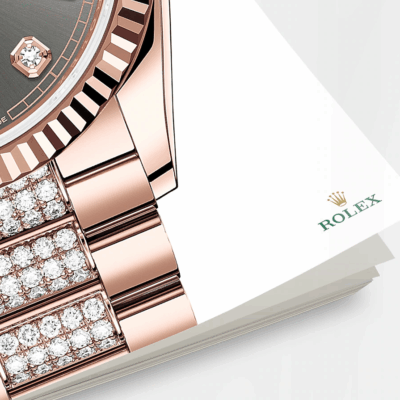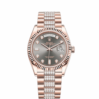 - Dial color: Slate dial with a fine sunrays and 10 Diamonds as hour markers framed in 18k Everose Gold, 2 of which are baguette-cut at 6 and 9 o’clock