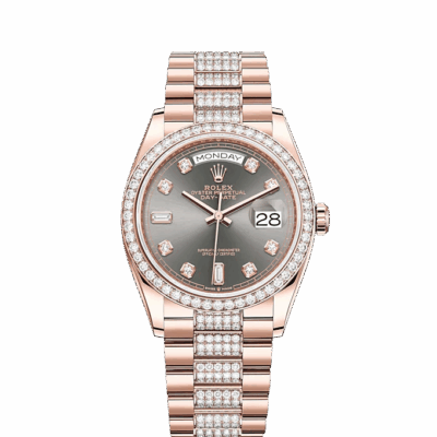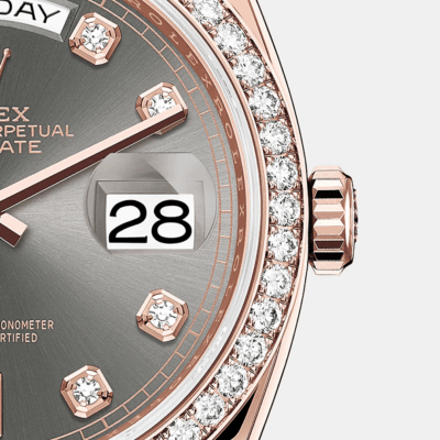 - Dial color: Slate dial with hour markers as Diamonds in 18k Everose gold settings and baguette-cut diamonds at 6 and 9 o’clock