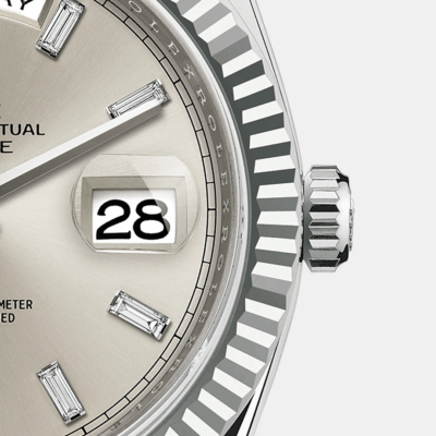 - Dial color: Silver dial with a fine sunrays and 10 Baguette-cut Diamonds as hour markers framed in 18k White Gold