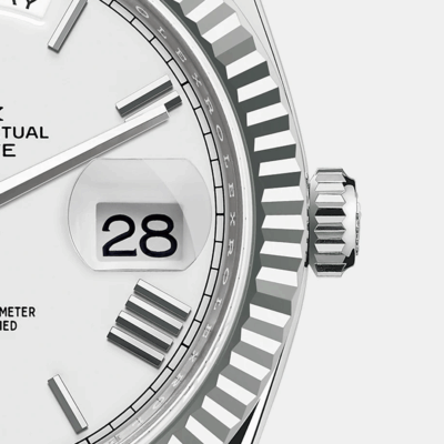• Dial color: White dial with a applied large polished 18k White Gold Roman numerals as hour markers