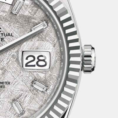 - Dial color: Meteorite dial with a 10 Baguette-cut Diamonds as hour markers framed in 18k White Gold