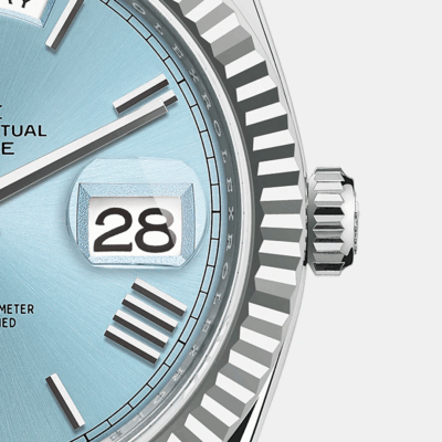 - Dial color: Ice blue with a applied polished 18k White Gold Roman numerals as hour markers