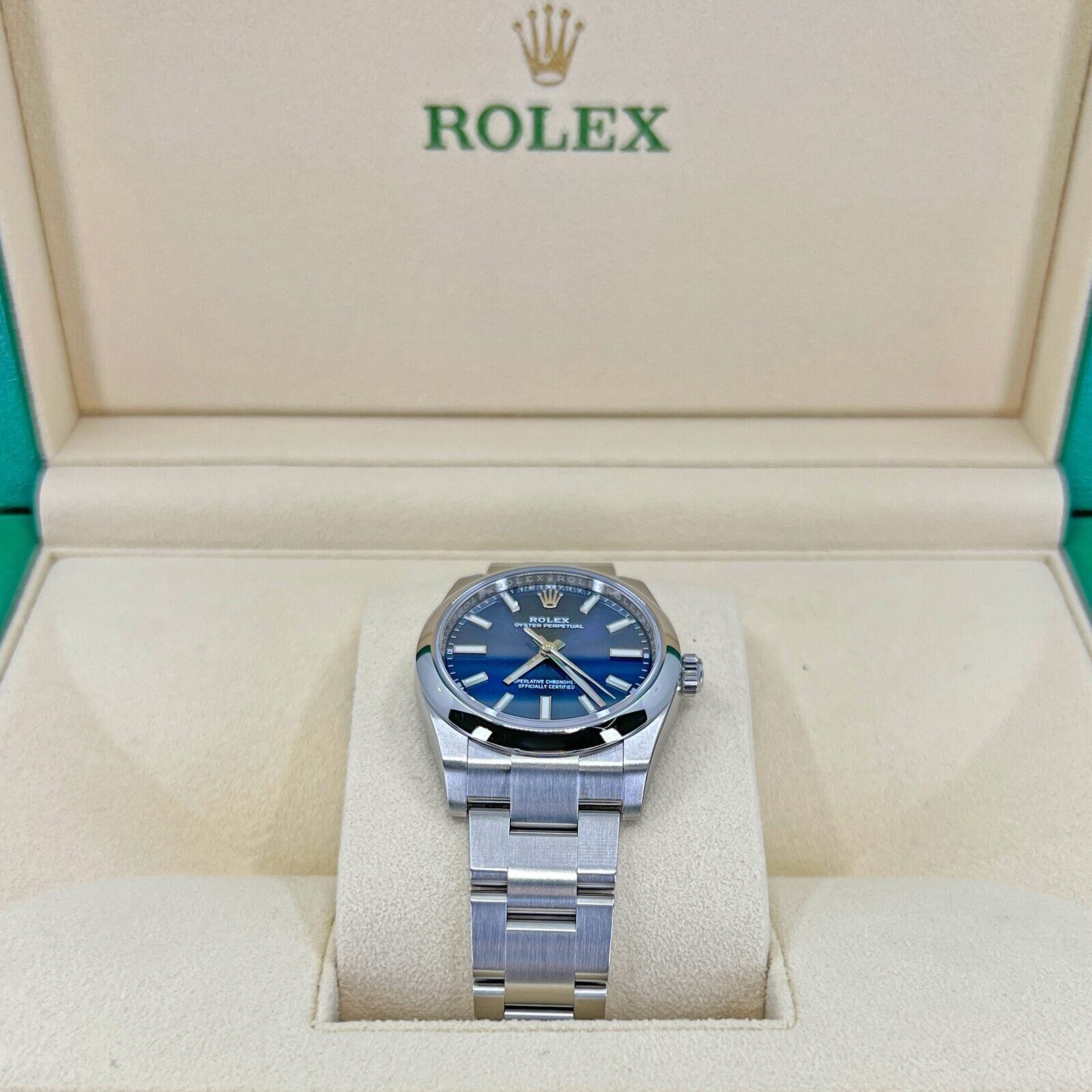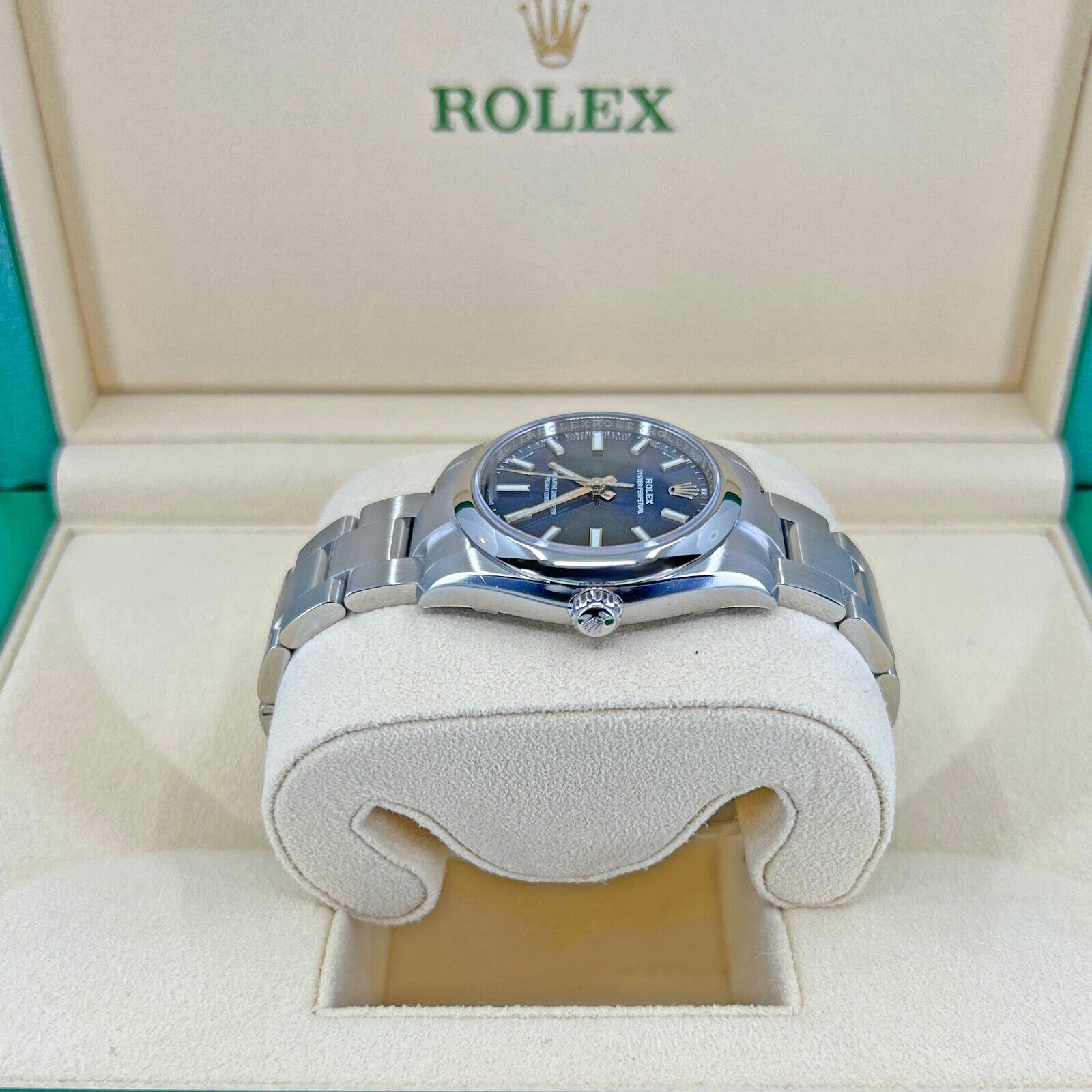 Rolex Oyster Perpetual, Brushed Stainless Steel case with polished finished sides 34mm watch. This model has Bright blue dial with highly legible Chromalight display with long-lasting blue luminescence with a fine sunray finish. Applied polished index hour markers with luminous fill. Polished hands, hour and minute hands with luminous fill. Fine printed minute/seconds and fractions of a second track on teh dial perimeter. Moreover, every five minutes are marked with a Roman numeral. Polished Stainless Steel screw-down crown with Rolex’s patented “Triplock” triple waterproofness system, ensuring that the crown screws down against the Oyster case as securely as a submarine hatch. The dial closed by a Scratch-resistant Sapphire Crystal and solid case back made. The watch is equipped domed fixed polished silver-tone Stainless Steel bezel. The watch is mechanical self-winding Manufacture Rolex 2232 contains 31 Jewels and has an approximate power reserve of 55 running the time only. This model presented on Brushed Stainless Steel Oyster bracelet with flat three-piece links and a Folding Oysterlock safety clasp with Easylink 5 mm comfort extension link. The water resistance is up to 100m/330ft (10 ATM).
