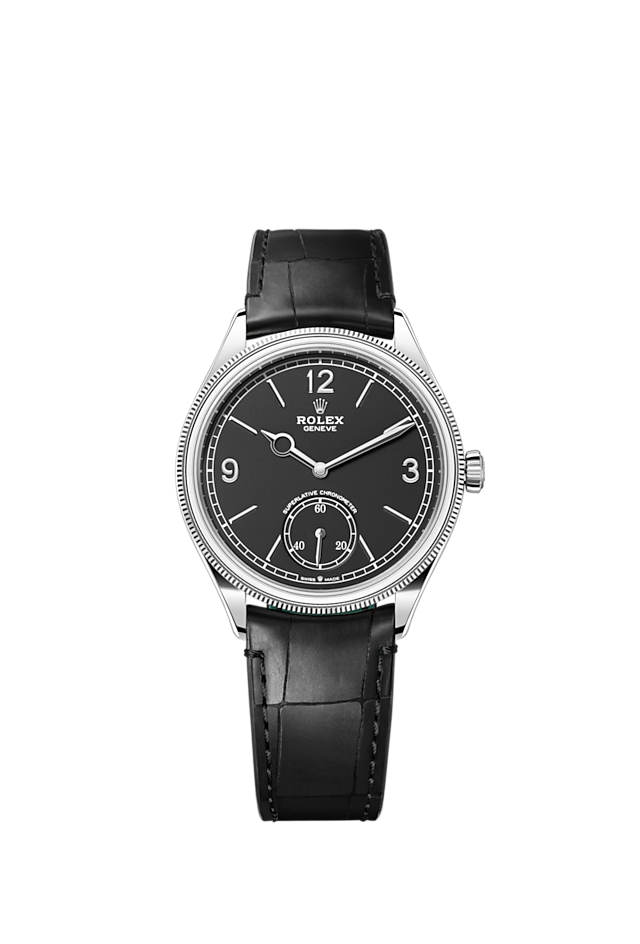 Unworn watch Rolex Perpetual 1908, 39mm, 18k White Gold, Ref# 52509-0002. Striving for the highest level of quality to achieve flawless, long-lasting results is the life philosophy of Rolex. It is in this vein that the global brand has developed a classic collection of watches with a new name and a new look, modestly dressy, ideal for a business suit – Rolex Perpetual 1908. Paying homage to the year in which the “Rolex” lettering first appeared on the dials, the entire Perpetual 1908 model inspired by the watchmaker’s first creation to feature a self-winding rotor. Proof of this is the stunning Intense Black dial with superbly long and narrow 18k White Gold applied indexes and Arabic numerals at 12, 3 and 9 o’clock. At 6 o’clock is a small second’s dial, sportier than you might expect, with 20, 40 and 60 on the track. An elegant sword-shaped minute hand with a classic hour hand marked with a ring at the tip, made of 18k White Gold. A well-readable minute scale is applied along the outer contour of the dial. All this charm is complemented by a ribbed, for a comfortable grip, domed screw-down crown in 18k Yellow Gold with the Rolex logo. The dial is covered with a scratch-resistant sapphire crystal. The highlight of the model is the two-tiered 18k White Gold bezel with a convex and tactile upper part and a characteristic grooved lower part. The model is powered by the in-house automatic Rolex mechanical movement caliber 7140, new 2023, contains 38 jewels and has an approximate power reserve of approximately 66 hours. The mesmerizing work of the mechanism can be seen through the transparent case back. This impressive watch is presented on a matt Black alligator leather strap with green lining and tone-on-tone stitching, custom made for this model. It is fitted with an 18k White Gold Dualclasp folding clasp. Thanks to its carefully shaped design, the Dualclasp is always centered on the wrist for maximum comfort. Water resistant up to 50m/165ft (5 ATM).