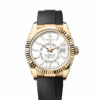 Unworn watch Rolex Sky-Dweller, 42mm, 18k Everose Gold, Ref# 336235-0003. New for 2023, a true masterpiece of engineering. Elegant and versatile, this stunning timepiece is the perfect luxury accessory for the modern traveler. This superb chronometer features an Intense white dial, which is the perfect backdrop for the luminous 18k Everose Gold index hour markers and hands, making it easy to read the time even in low light conditions. A well-readable minute scale is applied along the outer contour of the dial. The sophisticated multi-function display makes it easy to keep track of the time in two different time zones. The reference time is displayed in 24-hour format on an off-center dial, while the local time is read using the normal central hands. The annual calendar, named Saros, is powered by a patented mechanism and features an innovative display: the months of the year are shown in 12 windows around the circumference of the dial, behind the hour marker – the current month is displayed in red. The instantaneous date change is related to local time. The ribbed, easy-to-grip Triplock 18k Everose Gold screw-down crown features a triple water-resistance system in and Rolex logo decorated. The dial is covered with a scratch-resistant sapphire crystal with anti-reflective coating and Cyclops lens at the 3 o’clock position. The fluted bezel in 18k Everose Gold is a true hallmark of Rolex. Bidirectional rotatable, it is part of the Ring Command system and, when interacting with the crown, allows the user to select watch functions one by one and adjust them easily, quickly and simply. The model is powered by the innovative in-house Rolex mechanical movement, caliber 9002, contains 29 jewels and has an approximate power reserve of approximately 72 hours. This delightful watch is presented on an Oysterflex bracelet consisting of flexible metal blades coated with high performance elastomer, featuring a patented longitudinal cushion system that stabilizes the watch on the wrist, and fitted with an 18k Everose Gold Oysterclasp clasp. It also features the Rolex Glidelock extension system, developed and patented by the brand. Water resistant up to 100m/330ft (10 ATM).
