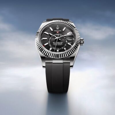 Unworn watch Rolex Sky-Dweller, 42mm, 18k White Gold, Ref# 336239-0002. New for 2023, a true masterpiece of engineering. Elegant and versatile, this stunning timepiece is the perfect luxury accessory for the modern traveler. This superb chronometer features a Black dial, which is the perfect backdrop for the luminous 18k White Gold index hour markers and hands, making it easy to read the time even in low light conditions. A well-readable minute scale is applied along the outer contour of the dial. The sophisticated multi-function display makes it easy to keep track of the time in two different time zones. The reference time is displayed in 24-hour format on an off-center dial, while the local time is read using the normal central hands. The annual calendar, named Saros, is powered by a patented mechanism and features an innovative display: the months of the year are shown in 12 windows around the circumference of the dial, behind the hour marker – the current month is displayed in red. The instantaneous date change is related to local time. The ribbed, easy-to-grip Triplock 18k White Gold screw-down crown features a triple water-resistance system in and Rolex logo decorated. The dial is covered with a scratch-resistant sapphire crystal with anti-reflective coating and Cyclops lens at the 3 o’clock position. The fluted bezel in 18k White Gold is a true hallmark of Rolex. Bidirectional rotatable, it is part of the Ring Command system and, when interacting with the crown, allows the user to select watch functions one by one and adjust them easily, quickly and simply. The model is powered by the innovative in-house Rolex mechanical movement, caliber 9002, contains 29 jewels and has an approximate power reserve of approximately 72 hours. This delightful watch is presented on an Oysterflex bracelet consisting of flexible metal blades coated with high performance elastomer, featuring a patented longitudinal cushion system that stabilizes the watch on the wrist, and fitted with an 18k White Gold Oysterclasp clasp. It also features the Rolex Glidelock extension system, developed and patented by the brand. Water resistant up to 100m/330ft (10 ATM).