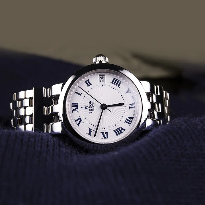 Unworn Ladies watch Tudor Clair De Rose, Stainless Steel, 26mm, Ref# M35200-0001. In 2017, Tudor introduced the completely redesigned Clair de Rose collection to luxury watch lovers, a collection of sophisticated, timeless timepieces that will impress any woman of the fairer sex. Delicate yet bold, the Opaline dial is complemented by modern design details such as a central guilloché finish. The dial is sure to grab attention with accented blue lacquered Roman numerals as hour markers. A distinctive feature of the aesthetics of the watch are the stylish blue hands in the form of swords. Bright and bold, this modern timepiece features on the outer perimeter of the dial there is an unusual minute-second scale. At the 3 o’clock, position there is a date window. Complementing all this charm is a screw-down crown Stainless Steel with chrome-plated corrugated adorned with a precious spinel cabochon. The dial closed by a Scratch-resistant Sapphire Crystal. The watch mechanism is sewn up by a solid Stainless Steel case back. An elegant feature of the model is the fixed stainless steel bezel with a polished finish. The model is equipped with a manufacture Tudor self-winding mechanical movement Calibre T201, contains 25 jewels and has an approximate power reserve approximately of 38 hours. This bright timepiece is presented on Stainless Steel bracelet comes as a five-link “rice grain” and Stainless Steel attachments with a folding clasp with a folding clasp and a Tudor rose design. Water resistant up to 100m/330ft (10 ATM).