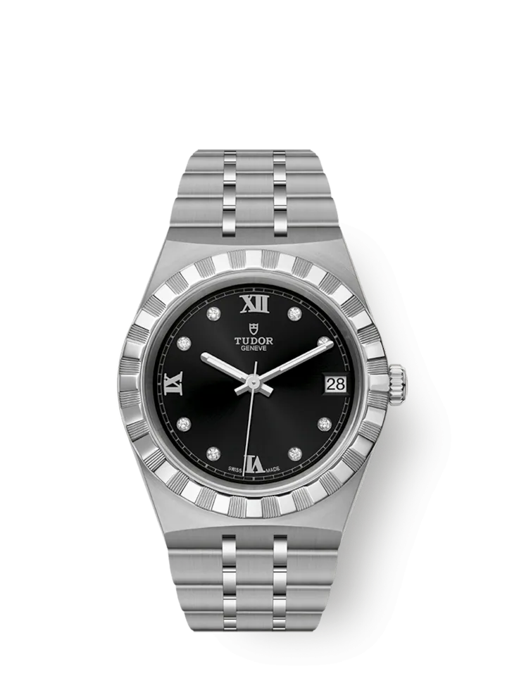 Unworn watch Tudor Royal, polished and satin finish Stainless Steel and Diamond-set, 34mm Ref# M28400-0004. TUDOR Royal is elegance and versatility in perfect balance. TUDOR Royal is a line of uncompromising watches, characterized by affordable prices, excellent quality, designed in a sport-chic style. However, thanks to their top-notch technical features and sophisticated aesthetics, the TUDOR Royal can also be classed as a classic. Emphasizing the luxurious style of the watch, the Black dial is decorated with sunbeams emanating from the center, creating elegant lighting effects and reflections. Applied silver-tone hour markers with Roman numerals complement it at 3, 6, 9 and 12 o’clock positions, as well as hour markers set with 8 brilliant-cut diamonds. The stylish Silver-tone hour and minute hands in the form of swords with luminous filling, as well as the elegant thin Silver-tone second hand look spectacular on it. A well-read minute scale is applied along outer contour dial. The functionality of the watch is enhanced by the date display, which is traditionally at the 3 o’clock position. Complementing all this charm is the screw-down Stainless Steel ribbed crown for a comfortable grip, bearing the TUDOR logo. The dial closed by a Scratch-resistant Sapphire Crystal and solid Stainless Steel case back. The characteristic fixed serrated stainless steel bezel with alternating polished surfaces and grooves gives the watch a unique personality. The model is equipped with a manufacture Tudor Self-winding mechanical movement Calibre T601, contains 25/26 jewels and has an approximate power reserve approximately of 38 hours. This spectacular timepiece is presented on an Integrated bracelet in 316L Stainless Steel of five rows, satin-brushed external and central links, polished intermediate links. The Stainless Steel folding clasp and safety catch, made using own unique Tudor technologies, guarantees maximum comfort on the wrist. Water resistant up to 100m/330ft (10 ATM).