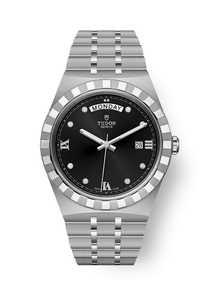 Unworn watch Tudor Royal, polished and satin finish Stainless Steel and Diamond-set, 41mm Ref# M28600-0004. TUDOR Royal is elegance and versatility in perfect balance. TUDOR Royal is a line of uncompromising watches, characterized by affordable prices, excellent quality, designed in a sport-chic style. However, thanks to their top-notch technical features and sophisticated aesthetics, the TUDOR Royal can also be classed as a classic. Emphasizing the luxurious style of the watch, the Black dial is decorated with sunbeams emanating from the center, creating elegant lighting effects and reflections. Applied silver-tone hour markers with Roman numerals complement it at 3, 6, 9 and 12 o’clock positions, as well as hour markers set with 8 brilliant-cut diamonds. The stylish Silver-tone hour and minute hands in the form of swords with luminous filling, as well as the elegant thin Silver-tone second hand look spectacular on it. A well-read minute scale is applied along outer contour dial. The functionality of the watch is enhanced by the date display, which is traditionally at the 3 o’clock position. The day of the week indicator is located at the 12 o’clock position. Complementing all this charm is the screw-down Stainless Steel ribbed crown for a comfortable grip, bearing the TUDOR logo. The dial closed by a Scratch-resistant Sapphire Crystal and solid Stainless Steel case back. The characteristic fixed serrated stainless steel bezel with alternating polished surfaces and grooves gives the watch a unique personality. The model is equipped with a manufacture Tudor Self-winding mechanical movement Calibre T603, contains 25 jewels and has an approximate power reserve approximately of 38 hours. This spectacular timepiece is presented on an Integrated bracelet in 316L Stainless Steel of five rows, satin-brushed external and central links, polished intermediate links. The Stainless Steel folding clasp and safety catch, made using own unique Tudor technologies, guarantees maximum comfort on the wrist. Water resistant up to 100m/330ft (10 ATM).
