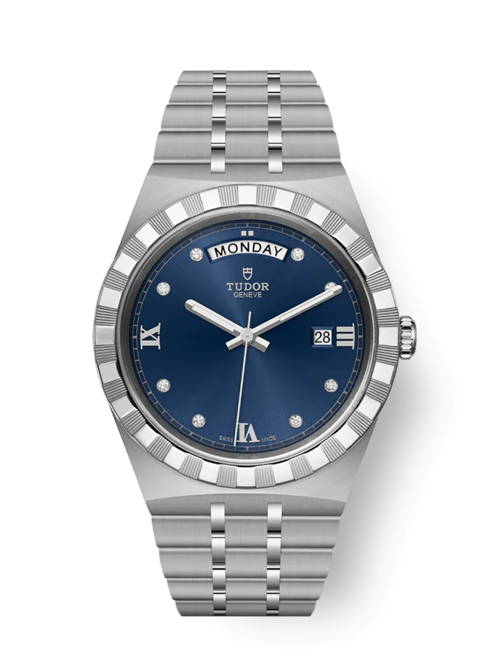 Unworn watch Tudor Royal, polished and satin finish Stainless Steel and Diamond-set, 41mm Ref# M28600-0006. TUDOR Royal is elegance and versatility in perfect balance. TUDOR Royal is a line of uncompromising watches, characterized by affordable prices, excellent quality, designed in a sport-chic style. However, thanks to their top-notch technical features and sophisticated aesthetics, the TUDOR Royal can also be classed as a classic. Emphasizing the luxurious style of the watch, the Blue dial is decorated with sunbeams emanating from the center, creating elegant lighting effects and reflections. Applied silver-tone hour markers with Roman numerals complement it at 3, 6, 9 and 12 o’clock positions, as well as hour markers set with 8 brilliant-cut diamonds. The stylish Silver-tone hour and minute hands in the form of swords with luminous filling, as well as the elegant thin Silver-tone second hand look spectacular on it. A well-read minute scale is applied along outer contour dial. The functionality of the watch is enhanced by the date display, which is traditionally at the 3 o’clock position. The day of the week indicator is located at the 12 o’clock position. Complementing all this charm is the screw-down Stainless Steel ribbed crown for a comfortable grip, bearing the TUDOR logo. The dial closed by a Scratch-resistant Sapphire Crystal and solid Stainless Steel case back. The characteristic fixed serrated stainless steel bezel with alternating polished surfaces and grooves gives the watch a unique personality. The model is equipped with a manufacture Tudor Self-winding mechanical movement Calibre T603, contains 25 jewels and has an approximate power reserve approximately of 38 hours. This spectacular timepiece is presented on an Integrated bracelet in 316L Stainless Steel of five rows, satin-brushed external and central links, polished intermediate links. The Stainless Steel folding clasp and safety catch, made using own unique Tudor technologies, guarantees maximum comfort on the wrist. Water resistant up to 100m/330ft (10 ATM).