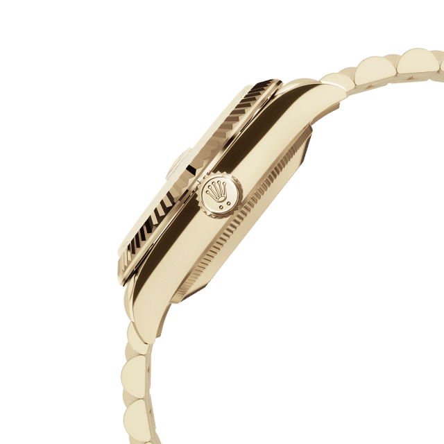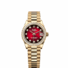 Introducing unworn classic Rolex Datejust 31 watch, Reference 278278-0049 a masterful blend of elegance and precision, showcasing Rolex’s commitment to timeless design and exceptional craftsmanship. Crafted from 18k Yellow Gold, the 31mm Oyster case exudes a warm, luxurious glow. This iconic model has red ombré dial, transitioning from a vibrant center to a deep black edge, is set with diamonds, creating a captivating visual effect. This design pays homage to a style Rolex introduced in the 1980s and reintroduced in 2019, involving a delicate application of black lacquer to achieve the gradient effect. At the heart of its design, the dial proudly displays an applied 18k Yellow Gold Rolex Crown at 12 o’clock, accompanied by traditionally polished 18k Yellow Gold hands that glide with effortless precision. The iconic Cyclops lens, ensuring superior readability, magnifies the signature date window at 3 o’clock. Special attention is given to the screw-down crown, crafted from 18k Yellow Gold and finished with a ribbed edge for secure handling. Embellished with the Rolex emblem on its tip, it incorporates the Twinlock double waterproofness system, ensuring reliable resistance to moisture and dust. Protecting the dial is a scratch-resistant sapphire crystal, seamlessly paired with a solid case back for enhanced durability. Framing the dial is a Fluted fixed polished 18k Yellow Gold bezel, embodying the watch’s refined aesthetic. Powering this piece is the in-house Rolex Caliber 2236 — a self-winding mechanical movement boasting 31 jewels and a 55-hour power reserve. Engineered with Rolex’s patented Chronergy escapement and Parachrom hairspring, this movement ensures unmatched precision, resilience to shocks and magnetic fields, and outstanding performance. The timepiece is fitted with the iconic President bracelet, characterized by its semi-circular three-piece links, providing both comfort and a distinguished aesthetic. The bracelet’s concealed Crownclasp ensures seamless integration with the case, maintaining the watch’s elegant profile. The water resistance is up to 100m/330ft (10 ATM).