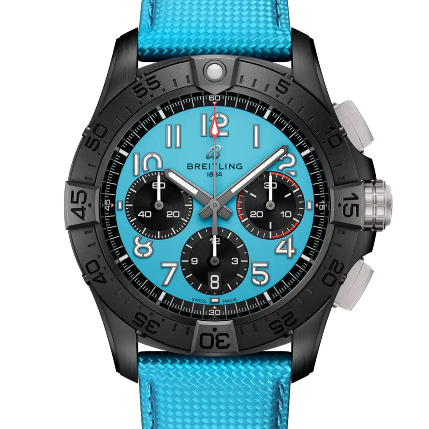 The Breitling Avenger B01 Chronograph 42 Night Mission is a powerhouse of precision and presence, built for professionals who demand extreme durability and accuracy. This bold 42 mm model features a robust black ceramic case that’s both lightweight and scratch-resistant, paired with a sleek Turquoise dial that offers outstanding readability in all conditions. Equipped with the in-house Breitling Manufacture Caliber 01, this COSC-certified chronograph delivers top-tier performance with a 70-hour power reserve and column-wheel mechanism. Rugged yet refined, the Super Avenger is designed for action with its unidirectional bezel, screw-down crown, and 300-meter water resistance. A military leather strap in Turquoise completes this tactical tool for the wrist.