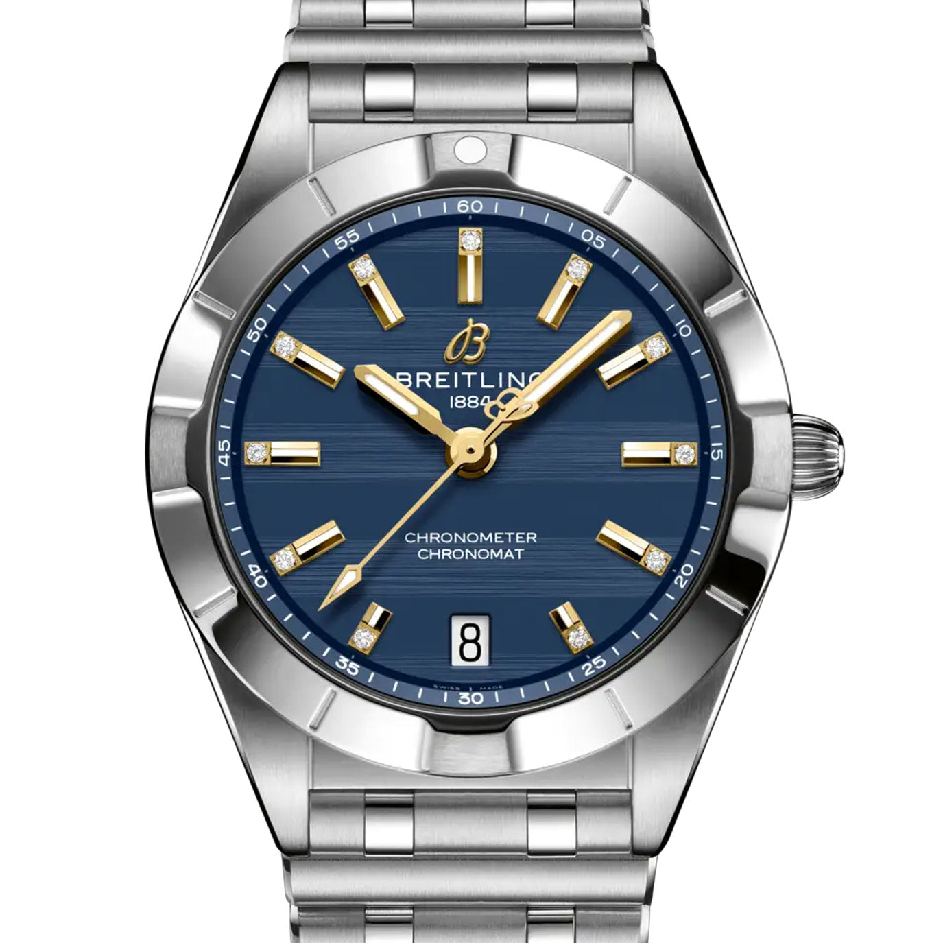 The Breitling Chronomat 32 Six Nations France is a refined fusion of sportiness and elegance, designed for women who appreciate precision and contemporary design. With its compact 32 mm stainless steel case, the watch offers a sleek silhouette that remains highly durable and water-resistant to 100 meters. At its core is the Breitling Caliber 77—an advanced SuperQuartz™ thermocompensated movement that is ten times more accurate than standard quartz and features an end-of-life (EOL) indicator. The cambered sapphire crystal with double anti-reflective coating ensures optimal legibility, while the dial is enhanced by a subtle date display. Paired with a polished stainless steel bracelet, this versatile timepiece effortlessly transitions from everyday wear to more formal occasions with signature Breitling sophistication.