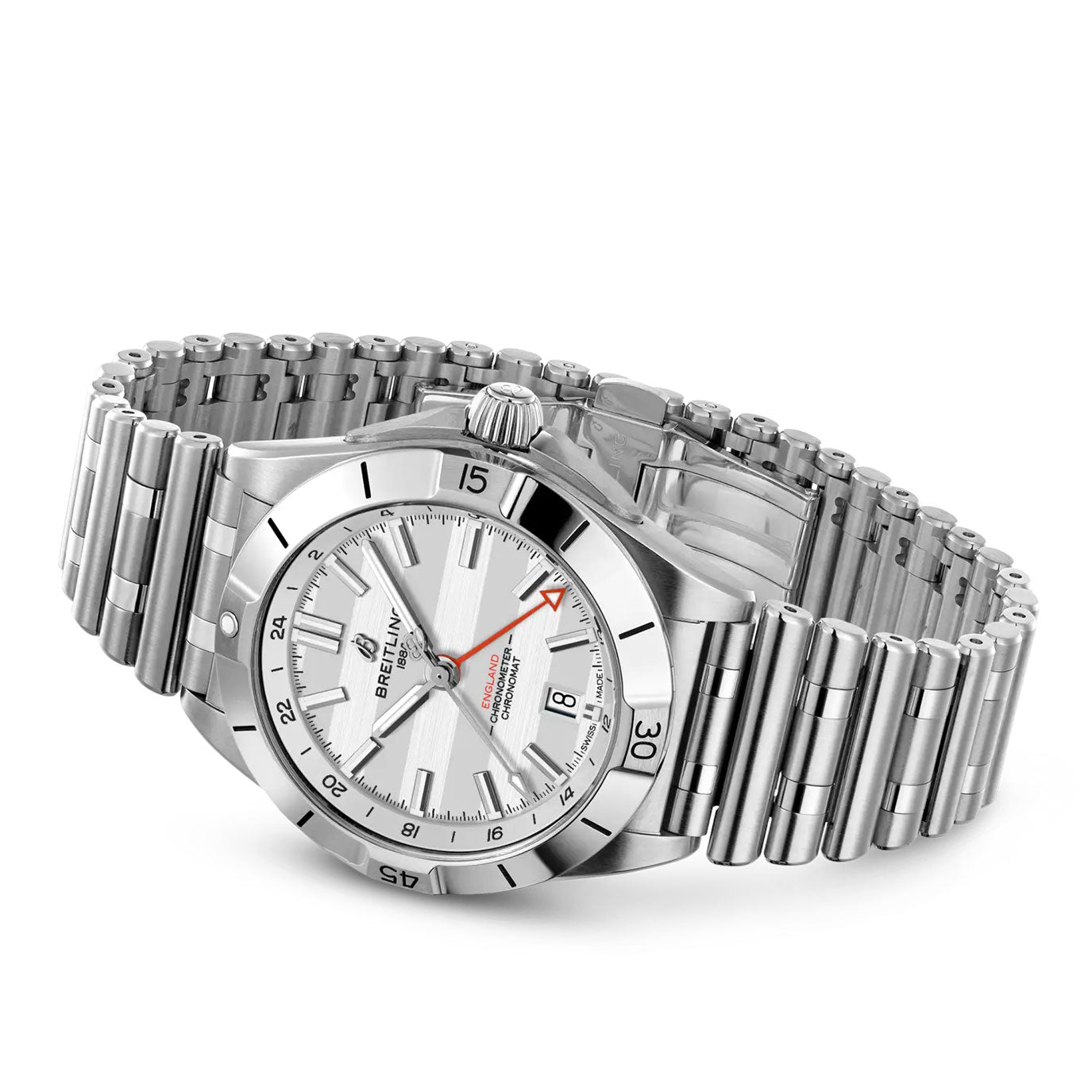 The Breitling Chronomat Automatic GMT 40 Six Nations England is the ultimate travel companion, combining dive-watch robustness with dual-time functionality. Crafted in stainless steel, the 40 mm case is fitted with a unidirectional ratcheted bezel and a screw-locked crown, ensuring water resistance up to 200 meters. Its clean dial layout features a second time zone via a 24-hour hand, making it ideal for adventurers and jetsetters. At its core is the COSC-certified Breitling Caliber 32, a self-winding mechanical movement offering a 42-hour power reserve and exceptional reliability. The cambered sapphire crystal with anti-reflective treatment and the solid stainless steel bracelet complete the look of this sporty yet refined tool watch, perfect for daily wear or distant journeys.
