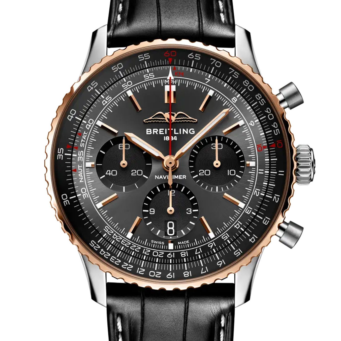 The Breitling Navitimer B01 Chronograph 43 is a modern evolution of a true aviation icon, beloved since 1952 by pilots and watch enthusiasts alike. This refined edition features a luxurious 18k red gold and stainless steel case paired with a deep black dial and contrasting subdials for enhanced legibility. Powered by the COSC-certified Breitling Manufacture Caliber 01, the watch delivers chronograph functionality and an impressive 70-hour power reserve. The signature circular slide rule—used by aviators for calculations—remains a hallmark of this classic design. Finished with a black alligator leather strap and folding clasp, this timepiece blends timeless heritage with contemporary precision.