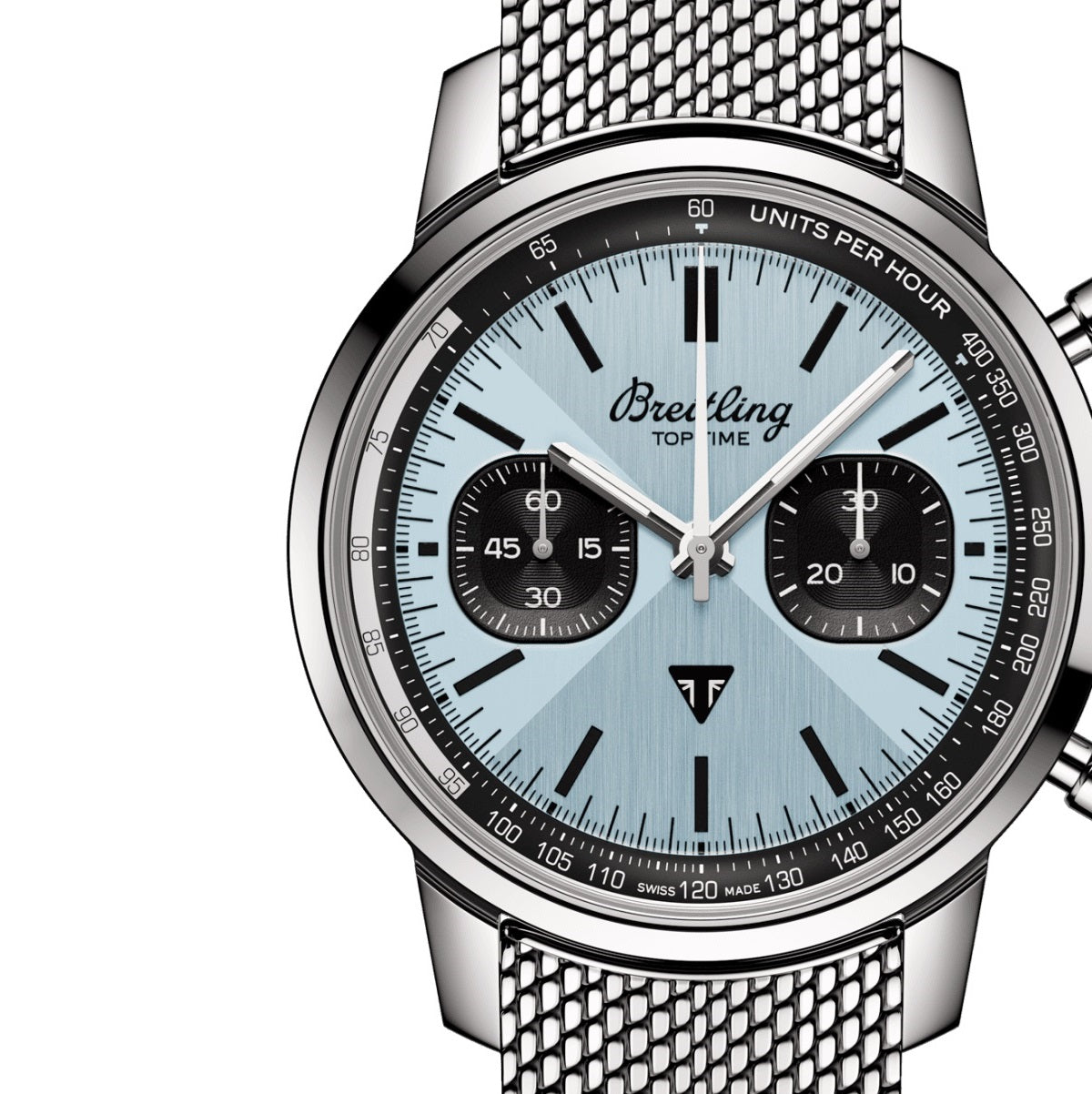 Introducing the Breitling Top Time B01 Triumph, a distinctive timepiece that combines vintage aesthetics with modern craftsmanship. Featuring an ice-blue dial inspired by the Triumph Thunderbird 6T from 1951 and the vintage Breitling Top Time Ref. 815, this watch is a tribute to classic design. The 41mm stainless steel case houses the Breitling Manufacture Caliber 01, offering a 70-hour power reserve and exceptional chronograph functionality. The dial includes a “Zorro” design and contrasting subdials, evoking a vintage dashboard look. This watch is offered in unworn condition, complete with the original Breitling box, booklets, and a Breitling warranty card dated 2024. This full set guarantees authenticity and adds to its collectible value. The Top Time B01 Triumph is perfect for those who appreciate a blend of heritage and innovation in a luxury timepiece. Don’t miss the opportunity to own this unique piece of horological history.