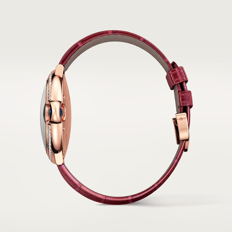 Exuding timeless elegance and masterful craftsmanship, the Cartier Ballon Bleu 36mm Women’s Watch Ref# WJBB0034 is a sophisticated expression of modern luxury. Encased in polished 18k Rose Gold, this timepiece showcases a gracefully rounded silhouette that exemplifies the collection’s signature design language. The Lacquered silvered opaline dial features bold black Roman numeral hour markers, radiating from the signature crown curve—creating a striking visual rhythm. In the center of the dial is an exquisite minute track, where a distinct square indicator marks each five-minute increment. This thoughtful layout offers a modern twist on traditional timekeeping, combining clarity with character. Sleek, blued steel sword-shaped hands sweep across the dial, guided by the precision of the Cartier Caliber 076 automatic movement. This in-house movement contains 25 jewels and offers a dependable power reserve of approximately 38 hours. The bezel, crafted from luxurious 18k Rose Gold, is adorned with 54 brilliant-cut diamonds, adding a dazzling frame of light to the timepiece. Each diamond is meticulously set to enhance both the elegance and the radiance of the design, transforming the bezel into a luminous halo that elevates the watch from classic to extraordinary. Adding a signature touch of elegance, the fluted 18k Rose Gold crown is adorned with a synthetic blue sapphire cabochon, subtly integrated into the case profile. A scratch-resistant sapphire crystal protects the dial, while a solid case back ensures durability and refinement. Paired with a luxurious Burgundy alligator leather strap and secured by a matching 18k Rose Gold Tang Buckle, this timepiece delivers exceptional comfort and enduring style. Water-resistant up to 30 meters (100 feet), the Ballon Bleu WJBB0034 is a perfect fusion of form and function—refined for the modern Ladies.