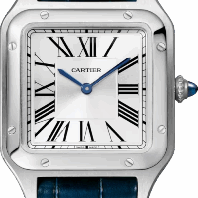 Elevating a legendary silhouette with refined brilliance, the Cartier Santos-Dumont de Cartier Ref# WSSA0023, Small Watch brings together timeless design and modern innovation. Exquisitely detailed and versatile, this timepiece is perfect for those who appreciate understated luxury and everyday elegance. The 38mm x 27.5mm square case, crafted from Stainless Steel with polished beveled edges, delivers a bold yet balanced presence on the wrist. The standout feature is the Stainless Steel bezel, securely fastened with Cartier’s signature exposed screws. The polished beaded Stainless Steel crown, set with a faceted synthetic spinel cabochon, completes the design with an iconic flourish. The silvered satin-brushed dial with sunray effect is graced with bold black Roman numeral hour markers, a fine minute/seconds track along the perimeter, reminiscent of railway tracks and blued steel sword-shaped hands, offering striking legibility against the light-toned background. At its heart, the watch houses Cartier’s in-house quartz movement, this watch ensures effortless, maintenance-free performance for daily wear. Scratch-resistant sapphire crystal and a robust case back protect the dial and movement, ensuring long-lasting, accurate performance. A Navy Blue alligator leather strap adds warmth and texture, paired with a classic Stainless Steel Tang buckle for a secure, comfortable fit. The unworn Cartier Santos-Dumont de Cartier WSSA0023 with water resistant to 30 meters (100 feet) is the epitome of quiet luxury, effortlessly bridging the gap between daywear elegance and evening refinement.