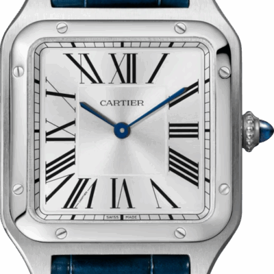 Elevating a legendary silhouette with refined brilliance, the Cartier Santos Dumont de Cartier Ref# WSSA0022, Large Watch brings together timeless design and modern innovation. Exquisitely detailed and versatile, this timepiece is perfect for those who appreciate understated luxury and everyday elegance. The 43.5mm x 31.4mm square case, crafted from Stainless Steel with polished beveled edges, delivers a bold yet balanced presence on the wrist. The standout feature is the Stainless Steel bezel, securely fastened with Cartier’s signature exposed screws. The polished beaded Stainless Steel crown, set with a faceted synthetic spinel cabochon, completes the design with an iconic flourish. The silvered satin-brushed dial with sunray effect is graced with bold black Roman numeral hour markers, a fine minute/seconds track along the perimeter, reminiscent of railway tracks and blued steel sword-shaped hands, offering striking legibility against the light-toned background. At its heart, the watch houses Cartier’s in-house quartz movement, this watch ensures effortless, maintenance-free performance for daily wear. Scratch-resistant sapphire crystal and a robust case back protect the dial and movement, ensuring long-lasting, accurate performance. A Navy Blue alligator leather strap adds warmth and texture, paired with a classic Stainless Steel Tang buckle for a secure, comfortable fit. The unworn Cartier Dumont de Cartier WSSA0022 with water resistant to 30 meters (100 feet) is the epitome of quiet luxury, effortlessly bridging the gap between daywear elegance and evening refinement.