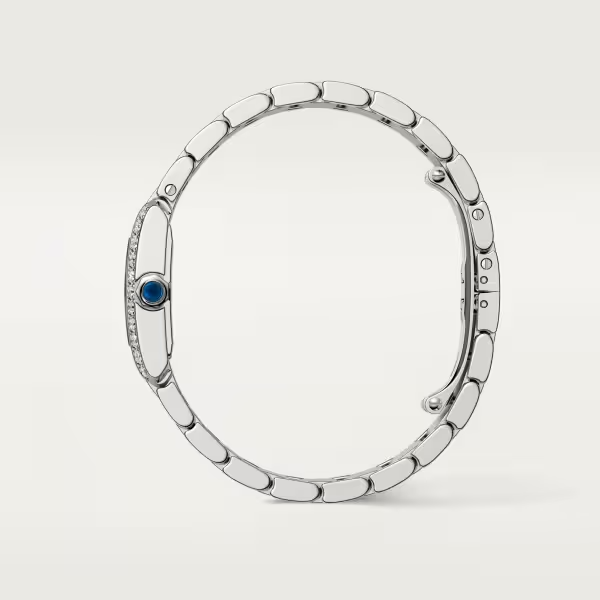 Introducing the Cartier Tank Française Ref# W4TA0020 — a refined symbol of feminine sophistication and timeless design. This authentic Cartier fashion watch for women reimagines the iconic Tank silhouette with a modern touch of brilliance, perfect for those who value elegance with a hint of sparkle. Crafted from brushed and polished Stainless Steel, the small rectangular case measures 25.7mm x 21.2mm and is just 6.8mm thick, offering a sleek profile that hugs the wrist with grace. The smooth fixed bezel is beautifully accented with 22 brilliant-cut diamonds, totaling 0.70 carats, adding a luxurious shimmer without overwhelming the watch’s clean lines. The silver dial is classic Cartier: adorned with bold Roman numeral hour markers, a minute track along the inner rim, and elegant polished blue sword-shaped hands that capture the light with every move. Powering the watch is a precise Swiss quartz movement, ensuring accurate and maintenance-free timekeeping for daily wear. Further signature Cartier Stainless Steel crown is topped with a synthetic blue spinel, completing the maison’s unmistakable aesthetic and a scratch-resistant sapphire crystal that protects the dial. The brushed and polished Stainless Steel bracelet flows seamlessly into a folding clasp, delivering a secure, comfortable fit with a high-end finish. Water-resistant up to 30 meters (100 feet) and finished with a solid case back, the Tank Française W4TA0020 is a radiant timepiece that effortlessly balances fashion and function—perfect for women who appreciate enduring luxury with a contemporary flair.
