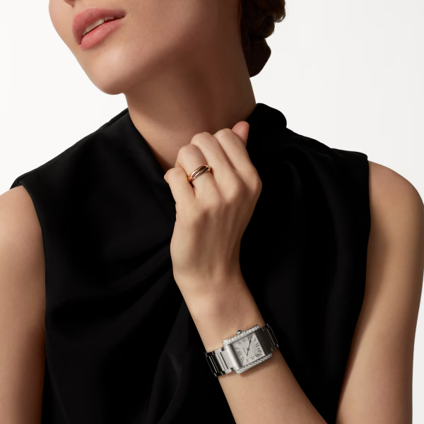 Introducing the Cartier Tank Française Ref# W4TA0021 — a refined symbol of feminine sophistication and timeless design. This authentic Cartier fashion watch for women reimagines the iconic Tank silhouette with a modern touch of brilliance, perfect for those who value elegance with a hint of sparkle. Crafted from brushed and polished Stainless Steel, the small rectangular case measures 32mm x 27mm and is just 7.1mm thick, offering a sleek profile that hugs the wrist with grace. The smooth fixed bezel is beautifully accented with 26 brilliant-cut diamonds totaling 1.09 carats, adding a luxurious shimmer without overwhelming the watch’s clean lines. The silver dial is classic Cartier: adorned with bold Roman numeral hour markers, a minute track along the inner rim, and elegant polished blue sword-shaped hands that capture the light with every move. Powering the watch is a precise Swiss quartz movement, ensuring accurate and maintenance-free timekeeping for daily wear. Further signature Cartier Stainless Steel crown is topped with a synthetic blue spinel, completing the maison’s unmistakable aesthetic and a scratch-resistant sapphire crystal that protects the dial. The brushed and polished Stainless Steel bracelet flows seamlessly into a folding clasp, delivering a secure, comfortable fit with a high-end finish. Water-resistant up to 30 meters (100 feet) and finished with a solid case back, the Tank Française W4TA0021 is a radiant timepiece that effortlessly balances fashion and function—perfect for women who appreciate enduring luxury with a contemporary flair.