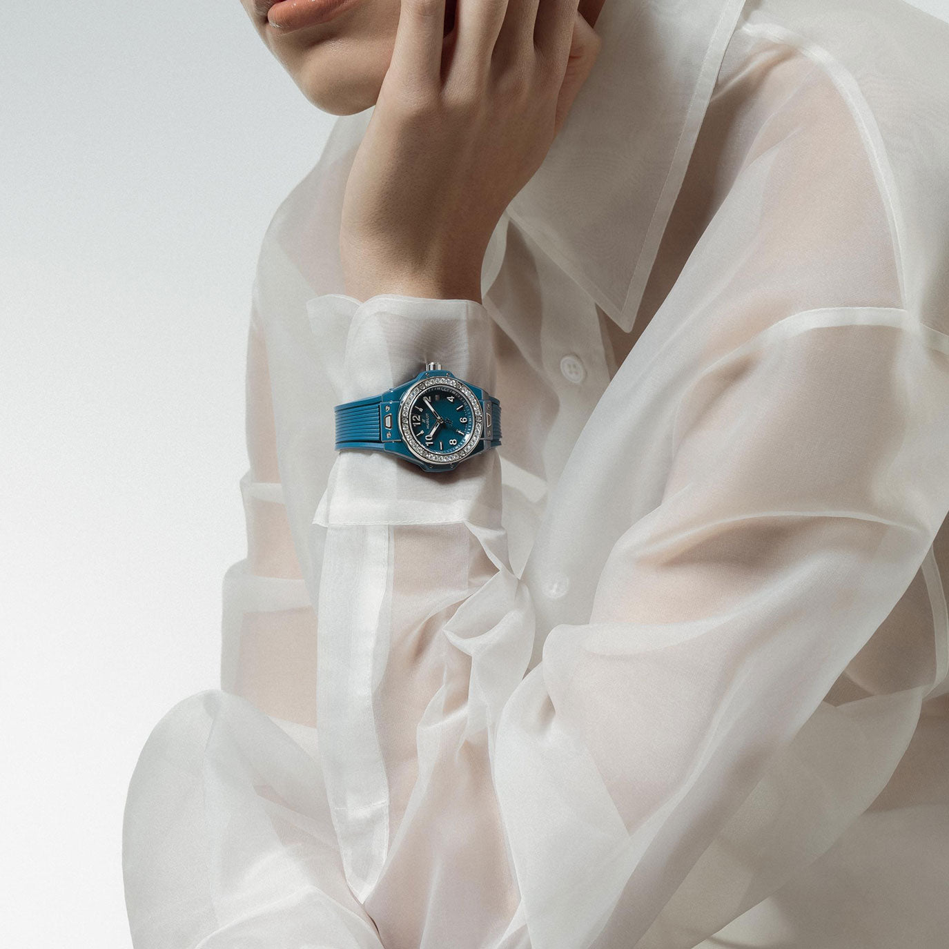 The Hublot Big Bang One Click Petrol Blue Ceramic Diamonds 33 mm is a captivating blend of feminine elegance and sporty sophistication. Crafted from polished and satin-finished petrol blue ceramic, the case is lightweight, durable, and ultra-modern. A bezel set with 36 brilliant-cut diamonds (0.76 ct) adds refined sparkle to the contemporary design. Powered by the HUB1120 self-winding movement, this timepiece offers central seconds and a date display at 3 o’clock, all visible beneath a sapphire crystal with anti-reflective treatment. The blue rubber strap, easily interchangeable via Hublot’s One Click system, ensures versatility and comfort. An exquisite fusion of materials and glamour in a compact, wearable size.