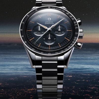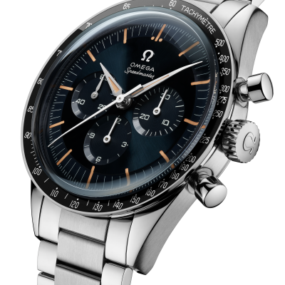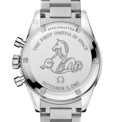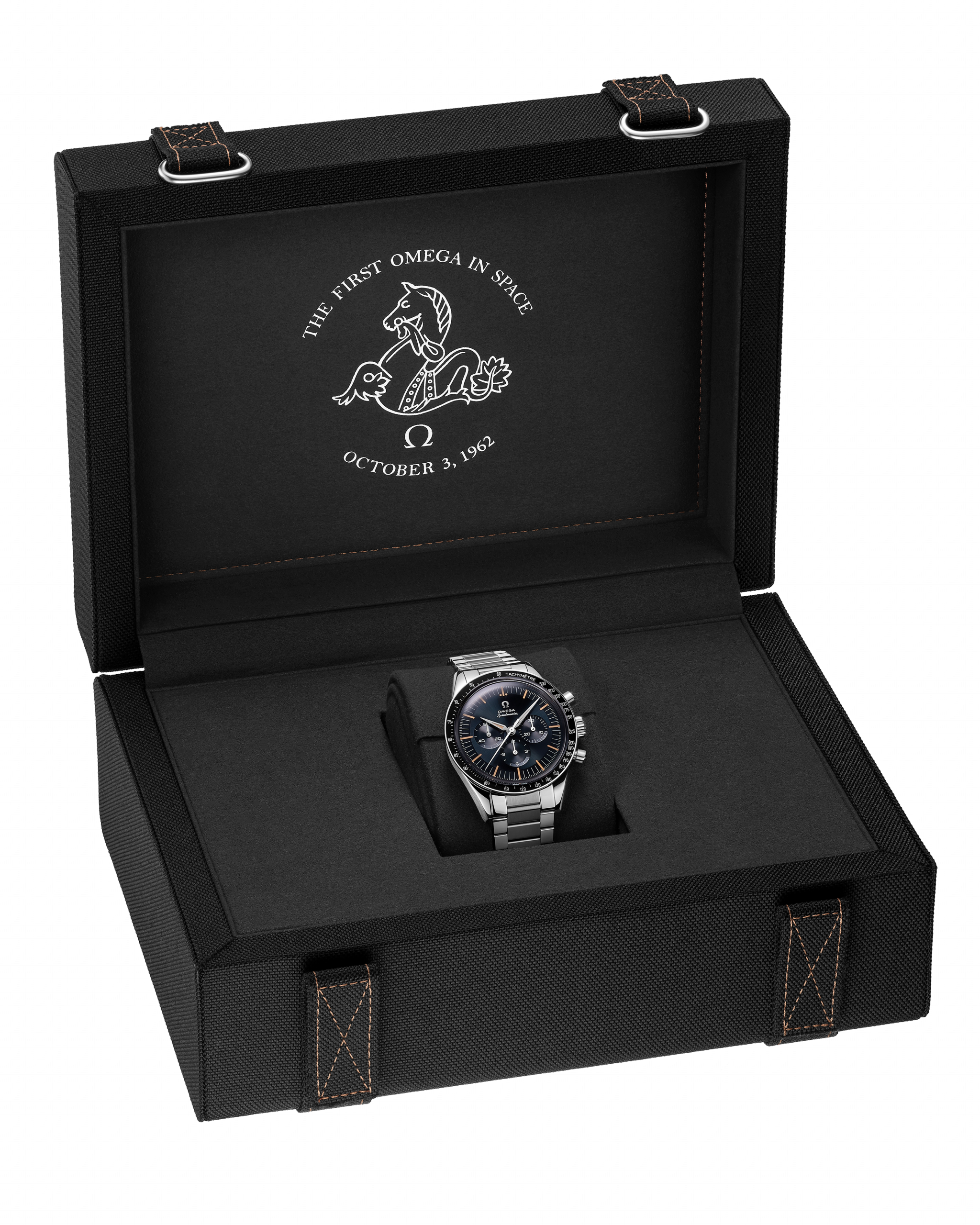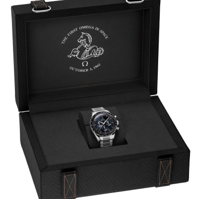 Introducing the unworn watch Omega Speedmaster First Omega in Space, Co-Axial Chronograph, Ref# 310.30.40.50.06.001 Tribute – a modern masterpiece born from the legacy of space exploration. On October 3rd, 1962, astronaut Walter Schirra wore his personal Speedmaster CK 2998 during the Sigma 7 mission of NASA’s Mercury programme, marking the first time an OMEGA was worn in space. This contemporary reimagining honors that pioneering spirit, capturing the timeless charm of the original with cutting-edge advancements. Crafted in polished and brushed stainless steel, the 39.70 mm case stays true to the 2nd generation Speedmaster design while integrating modern sophistication. Beneath the sapphire crystal, styled to echo the original hesalite look, lies a stunning grey-blue dial. CVD-coated to evoke the hue of early CK 2998 models, the dial features vintage Super-LumiNova-filled “Alpha” hands and indexes, paired with a crisp white varnished “Baton” seconds hand and three classic subdials. The iconic tachymeter scale, with the historically significant “Dot Over Ninety,” is set into a black aluminium bezel ring. Accents like the vintage OMEGA logo on both the dial and crown connect the past to the present, while the caseback is engraved with “THE FIRST OMEGA IN SPACE” and “OCTOBER 3, 1962,” flanking the beloved Seahorse medallion. At its core beats the Co-Axial Master Chronometer Manual‑winding Calibre 3861 — a contemporary evolution of the legendary Calibre 321, with beating at 21,600 vph, with 26 jewels and a 50-hour power reserve drives exceptional performance now boasting METAS-certified precision, magnetic resistance, and reliability worthy of the stars. It is paired with a polished and brushed stainless steel refined “flat links” bracelet, equipped with OMEGA’s patented comfort release system and Foldover butterfly clasp with comfort setting for a perfect fit in any environment—earthly or orbital. Presented in a collector-worthy box with a special “LEGENDARY MOONWATCH” leaflet, this Speedmaster is more than a timepiece—it’s a continuation of a legacy written in space.