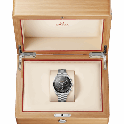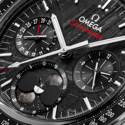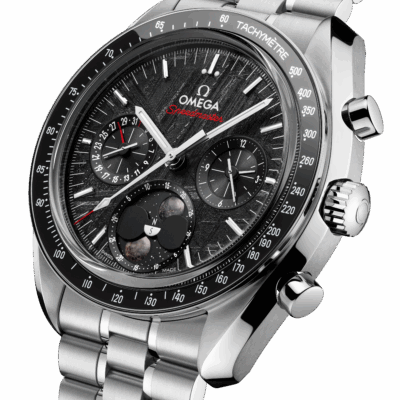 Introducing the unworn OMEGA Speedmaster Moonphase Ref# 304.30.43.52.01.001, a fascinating tribute to Omega’s enduring legacy of lunar exploration. The watch is housed in a 43mm case made from polished and brushed stainless steel. The PVD black-coated meteorite plate dial displays a fascinating texture, accentuated by hands and indexes made from 18k White Gold with a blue coating. Two chronograph sub-dials at 3 and 9 o’clock reflect the main design, featuring 18k White Gold hands on blue surfaces. Most spectacular is the moon phase display at 6 o’clock, which features intricately shaped domed moons made from a real lunar meteorite, offering views of both the northern and southern hemispheres. Scratch‑resistant sapphire crystal with anti‑reflective treatment on both sides ensures exceptional durability, preserving the pristine appearance of the dial. At the heart of this celestial masterpiece is the Omega Co-Axial Master Chronometer caliber 9914, beating at 28,800 vibrations per hour, with 45 jewels and a 60-hour power reserve – a METAS-certified movement that combines chronograph precision with exquisite craftsmanship. The final touch to this mesmerizing picture is the polished black fixed ceramic bezel with a white enamel tachymeter scale. The polished-brushed stainless steel integrated bracelet includes OMEGA’s patented comfort adjustment clasp for a personalized fit. With a water resistance of 5 bar (50 metres / 165 feet), the watch combines iconic design with everyday durability. This is not just a watch, but a piece of the Moon brought to Earth.
