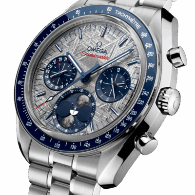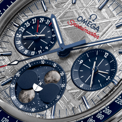 Introducing the unworn OMEGA Speedmaster Moonphase Ref# 304.30.43.52.06.001, a fascinating tribute to Omega’s enduring legacy of lunar exploration. The watch is housed in a 43mm case made from polished and brushed stainless steel. The galvanized meteorite grey dial displays a fascinating texture, accentuated by hands and indexes made from 18k White Gold with a blue coating. Two chronograph sub-dials at 3 and 9 o’clock reflect the main design, featuring 18k white gold hands on blue surfaces. Most spectacular is the moon phase display at 6 o’clock, which features intricately shaped domed moons made from a real lunar meteorite, offering views of both the northern and southern hemispheres. Scratch‑resistant sapphire crystal with anti‑reflective treatment on both sides ensures exceptional durability, preserving the pristine appearance of the dial. At the heart of this celestial masterpiece is the Omega Co-Axial Master Chronometer caliber 9914, beating at 28,800 vibrations per hour, with 45 jewels and a 60-hour power reserve – a METAS-certified movement that combines chronograph precision with exquisite craftsmanship. The final touch to this mesmerizing picture is the polished blue fixed ceramic bezel with a white enamel tachymeter scale. The polished-brushed stainless steel integrated bracelet includes OMEGA’s patented comfort adjustment clasp for a personalized fit. With a water resistance of 5 bar (50 metres / 165 feet), the watch combines iconic design with everyday durability. This is not just a watch, but a piece of the Moon brought to Earth.