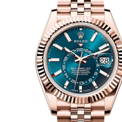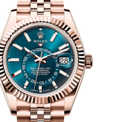 Introducing the Rolex Sky-Dweller, a pinnacle of luxurious craftsmanship and innovative functionality. This remarkable timepiece features a 42mm 18K Everose gold case, elegantly paired with a Blue-green dial. The dial is adorned with Chromalight display hour markers and hands for superior legibility, along with an off-center disc for the dual time zone display, providing a unique touch of sophistication. The fluted bezel adds a classic Rolex touch, while the scratch-resistant sapphire crystal ensures durability. Powered by the advanced Rolex Caliber 9002, the Sky-Dweller offers an impressive 72-hour power reserve and water resistance up to 100 meters, making it as practical as it is stylish. The Everose gold Jubilee bracelet, equipped with an Oysterclasp and Easylink comfort extension link, ensures a secure and comfortable fit. Offered in unworn condition, this Sky-Dweller comes as a full set, including the original Rolex box, booklets, and a Rolex warranty card dated 2024. Secure this extraordinary timepiece today and experience the blend of cutting-edge technology and timeless elegance that only Rolex can offer. Perfect for any collection, the Rolex Sky-Dweller is ready to accompany you on any journey, whether for business or leisure.