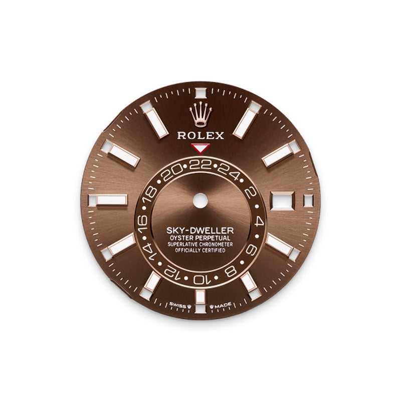 Introducing the Rolex Sky-Dweller, a pinnacle of luxurious craftsmanship and innovative functionality. This remarkable timepiece features a 42mm 18K Everose gold case, elegantly paired with a brown dial. The dial is adorned with Chromalight display hour markers and hands for superior legibility, along with an off-center disc for the dual time zone display, providing a unique touch of sophistication. The fluted bezel adds a classic Rolex touch, while the scratch-resistant sapphire crystal ensures durability. Powered by the advanced Rolex Caliber 9002, the Sky-Dweller offers an impressive 72-hour power reserve and water resistance up to 100 meters, making it as practical as it is stylish. The Everose gold Oyster bracelet, equipped with an Oysterclasp and Easylink comfort extension link, ensures a secure and comfortable fit. Offered in unworn condition, this Sky-Dweller comes as a full set, including the original Rolex box, booklets, and a Rolex warranty card dated 2024. Secure this extraordinary timepiece today and experience the blend of cutting-edge technology and timeless elegance that only Rolex can offer. Perfect for any collection, the Rolex Sky-Dweller is ready to accompany you on any journey, whether for business or leisure.